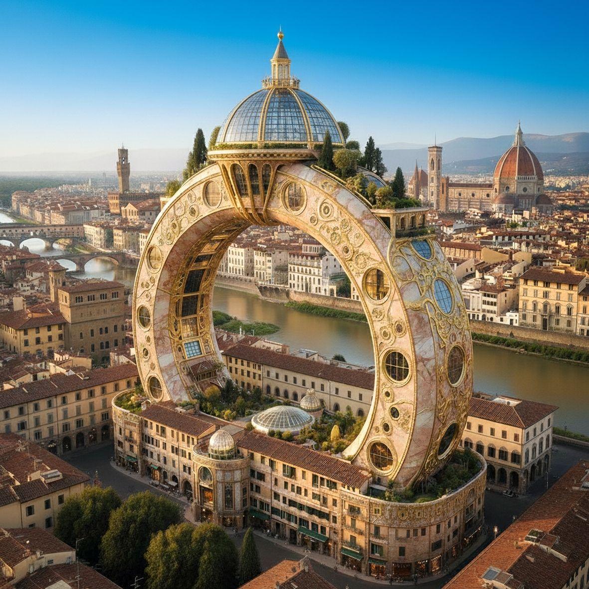 L'opera "L'Anello dell'Infinito" trasforma Firenze in un gioiello architettonico. Rappresenta una visione utopica dove il peso della storia (il "Building") diventa leggero e fantasioso ("Fanty"). È una celebrazione della capacità umana di immaginare nuove forme di convivenza tra il passato immutabile e un futuro onirico.