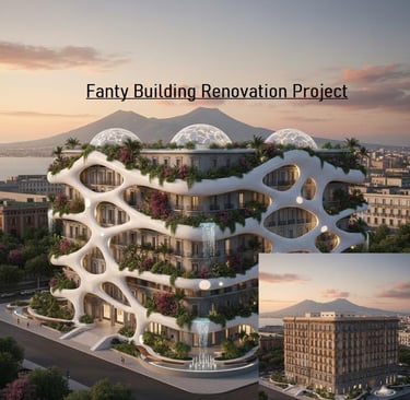 Applicazione Immediata di un "Intimo Strutturale Organico" (Mutanda): Un esoscheletro bianco, curvo e fluido (identico a quello visibile nell'immagine principale del Fanty Building) deve avvolgere l'intera facciata, rompendo la monotonia e integrando spazi verdi, cascate e nuovi volumi dinamici.