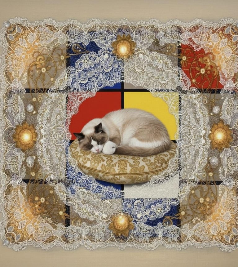 Intervento di Vestizione: Ogni linea nera di Mondrian deve essere coperta da un filo di pizzo dorato tridimensionale. La griglia deve diventare un ricamo.